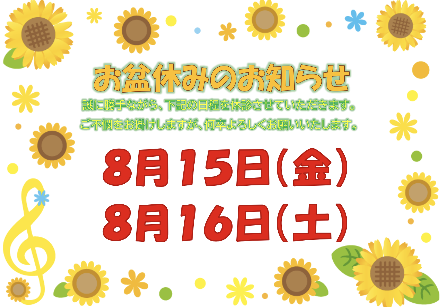 8月15日(金)・16日(土)・17日(日)お盆休みとなります。