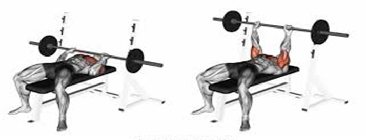ベンチ台に仰向けになり、バーベルを押し上げる動作を繰り返すことで、胸の大胸筋を中心に、肩の三角筋や腕の上腕三頭筋も一緒に鍛えることができます。