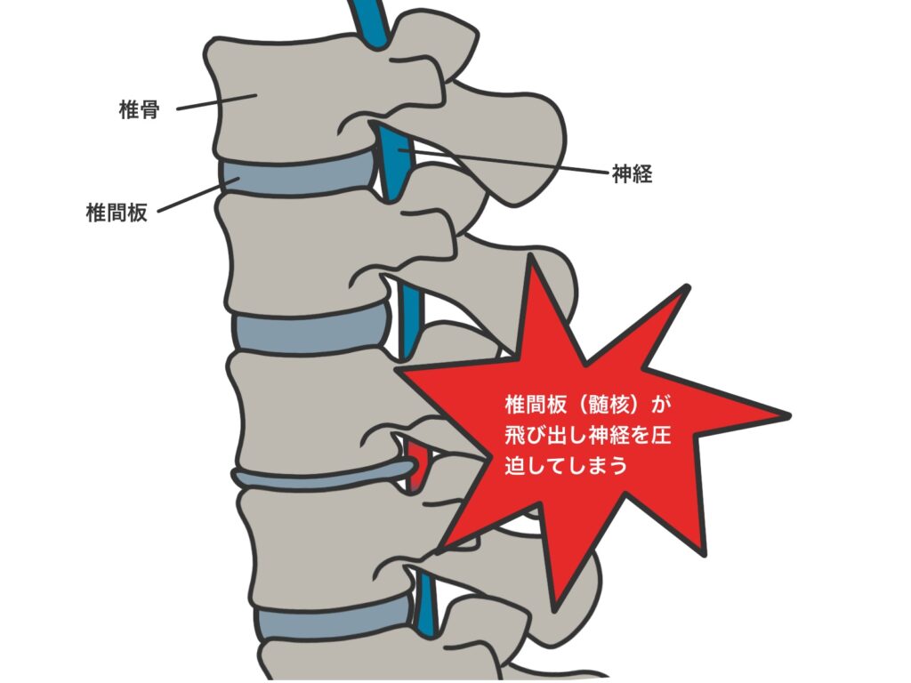 背骨の土台である骨盤が前後左右に傾くと、背骨にかかる体重のバランスが崩れます。特定の階層(主に腰椎の4番・5番)だけに過度な圧力がかかり続けることで、椎間板が耐えきれなくなり、パンクするように中身が飛び出してしまうのです。